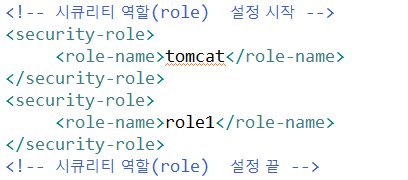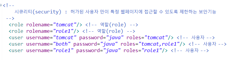 - 역할/사용자 : tomcat-users.xml에 등록된 역할/사용자