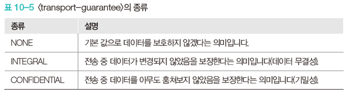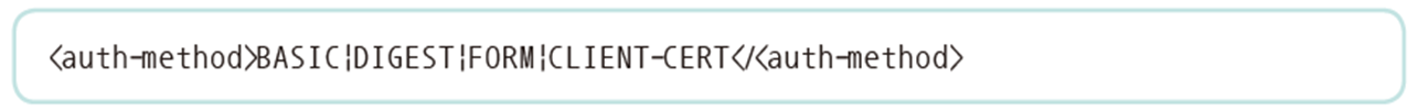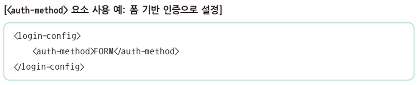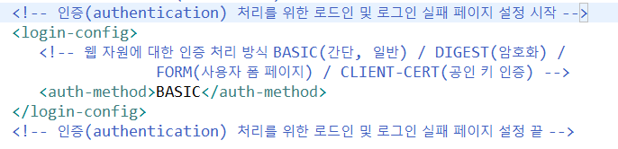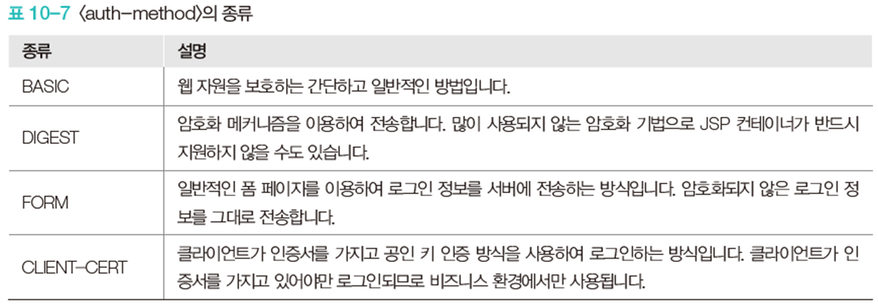 - 인증 처리 기법은 BASIC, DIGEST, FORM, CLIENT-CERT 등으로 이 중 하나를 <auth-method> 요소에 설정