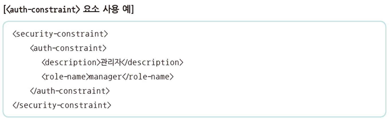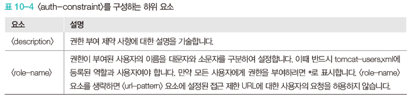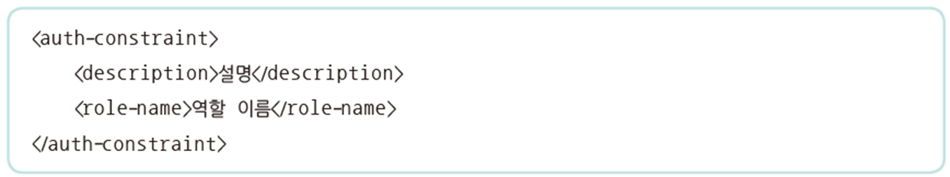 - <auth-constraint> 요소에는 <web-resource-collection> 요소의 <urlpattern>과 <http-method>에 설정된 경로에 접근할 수 있는 권한이 부여된 사용자의 이름을 지정