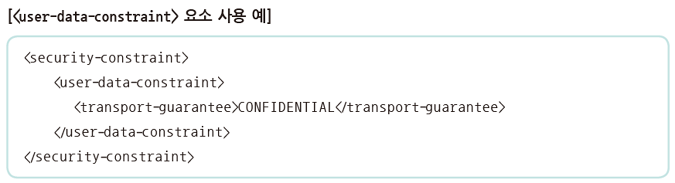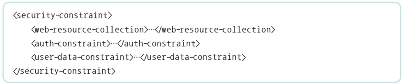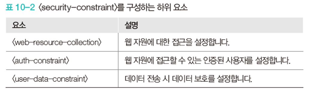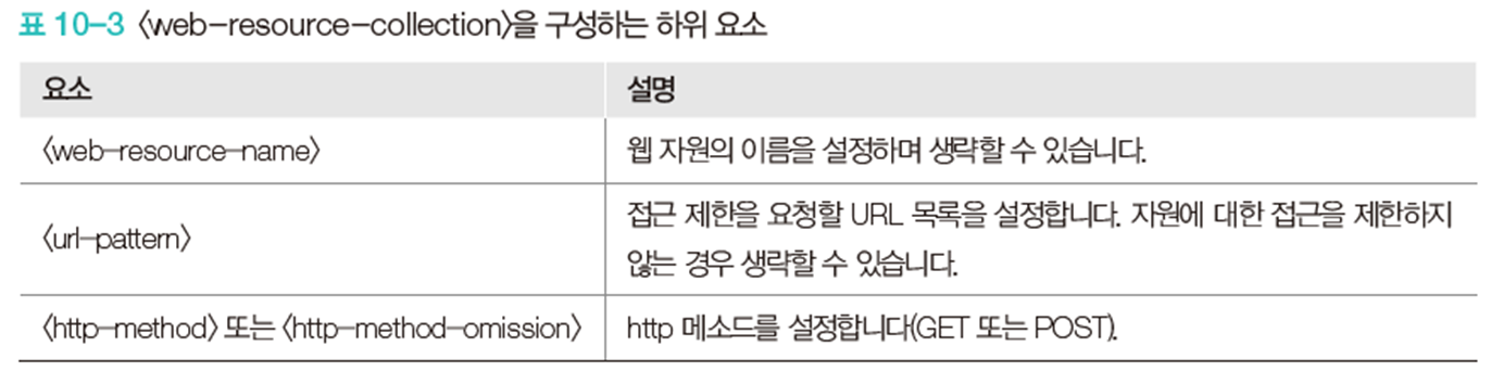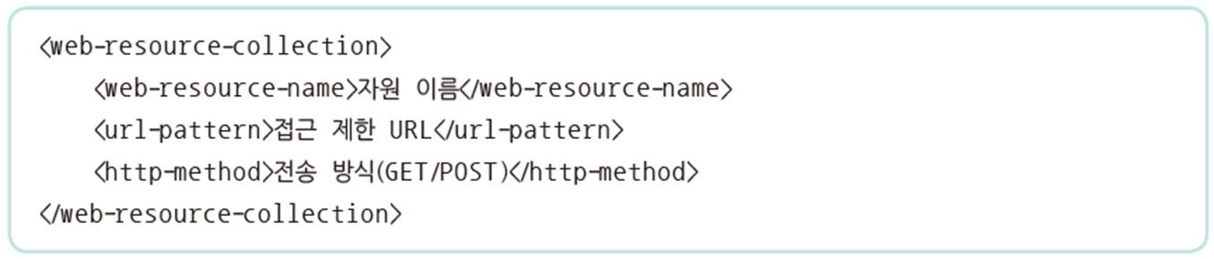 - <url-pattern>, <http-method>, <webresource-name> 등의 하위 요소로 구성