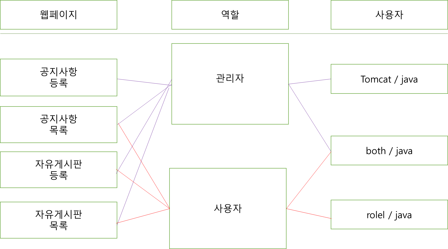 - 2개의 역할 ❶ tomcat, ❷ role1을 가지고, 3개의 사용자 ❸ tomcat, ❹ both, ❺ role1이 서로 다른 역할에 매핑