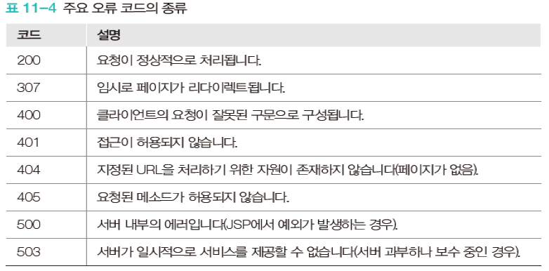 오류 코드는 웹 서버가 제공하는 기본 오류 페이지에 나타나는 404, 500과 같이 사용자의 요청이 올바르지 않을 때 출력되는 코드로 응답 상태 코드 라고도 함