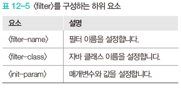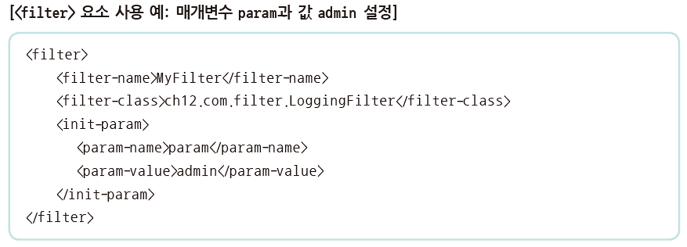 <filter> 요소는 웹 애플리케이션에서 자바 필터와 매개변수를 설정하는 데 사용