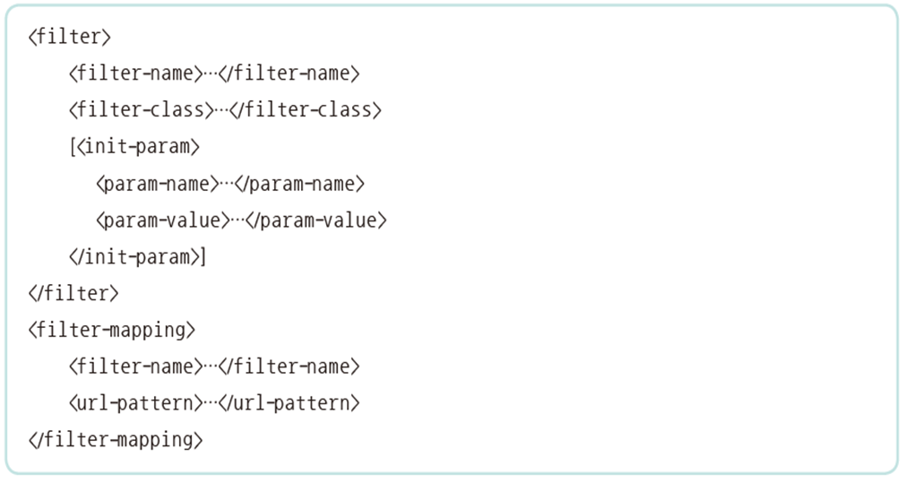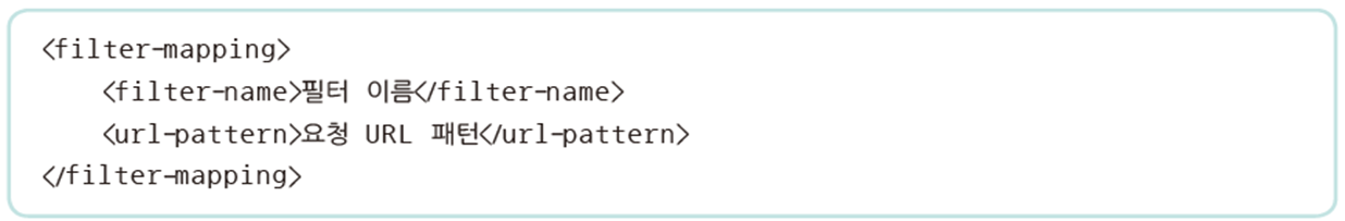 필터를 사용하려면 어떤 필터가 어떤 리소스에 대해 적용되는지 JSP 컨테이너에 알려주어야 함