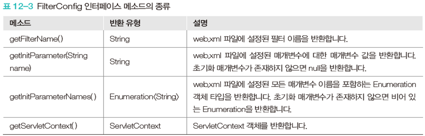 세 번째 매개변수 FilterChain 객체는 체인에서 다음 필터를 호출하는 데 사용 만약 호출 필터가 체인의 마지막 필터이면 체인의 끝에서 리소스를 호출