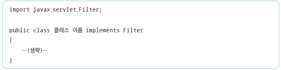 클라이언트와 서버의 리소스 사이에 위치한 필터의 기능을 제공하기 위해 자바 클래스로 구현해야 함