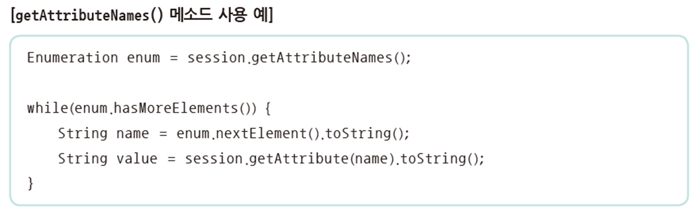 세션에 저장된 하나의 세션 속성 이름에 대한 속성 값을 얻어오려면 getAttribute( ) 메소드를 사용