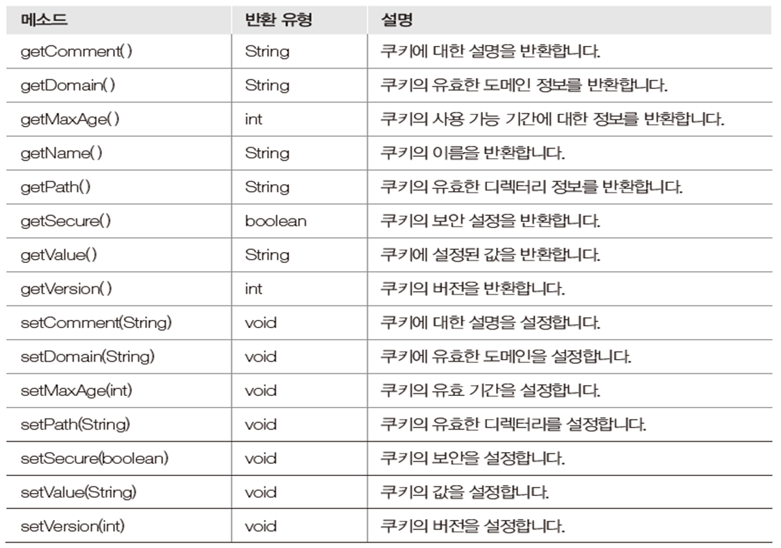 Cookie 클래스. 쿠키를 삭제하는 기능은 별도로 없음.