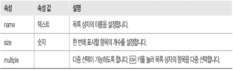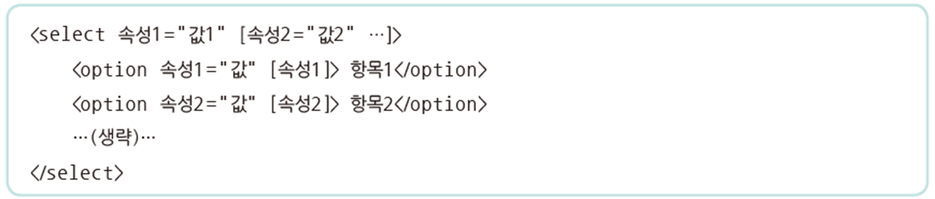 - 여러 개의 항목이 나타나는 목록 상자에서 항목을 선택하는 태그